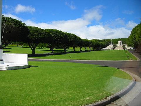 The scale of the ship is almost unbelievable. 270m long, 33m wide, 45,000 tons. She was originally armed with nine 16 inch guns, 10 five inch guns, 80 40mm anti-aircraft guns and 49 20mm anti-aircraft guns. In 1984 the five inch guns were reduced to six and she also carried 32 Tomahawk cruise missiles, 16 Harpoon missiles and four 20mm Phalanx chain guns. The ship took part in the latter part of World War 2 and provided naval gunfire support for Korea. She was then mothballed for many years, later refurbished as a result of Ronald Reagan's revitalisation of the US Navy, and then took part in Desert Storm, again providing naval gunfire support. We returned to our hotel via the National Memorial Cemetery at Punchbowl Crater. This is an official war cemetery, similar to that at Arlington. |